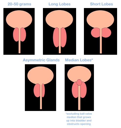 Because it provides direct visualization of the anatomy during the procedure, Prostiva treats the median and lateral lobe as well as asymmetrical prostates.  Here are some examples of prostate shapes that Prostiva® RF Therapy can treat: